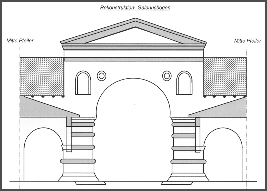Da das Monument nur ungenügend erhalten auf uns gekommen ist, lässt sich nur vermuten, das es sich ursprünglich um eine auf doppelter Pfeilerreihe ruhende, dreitorige Anlage gehandelt hat. Ausmaß und Ausschmückung gehören zu den prächtigsten Zeugnissen römischer Triumphalkunst. Anlass der Errichtung des Triumphbogens war der 297/8 n.Chr. errungene Sieg des Caesars Galerius über die Sassaniden; er diente damit der Erinnerung an dieses historische Ereignis und natürlich auch der Ehrung an Caesar Galerius und die drei weiteren Kaiser der ersten Tetrarchie Diokletian, Maximian und Constantius Chlorus. Dieser Schluss lässt sich aus den sowohl historischen als auch allegorischen Schilderungen und Darstellungen auf den noch erhaltenen Resten der Reliefs ziehen. |