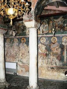 Textfeld: Im 13. Jahrhundert, während der Regierungszeit Kaiser Michael VIII Paleologos /1261-1282, wurde die Kirche repariert und das Holzdach erneuert. Während der Paleologenzeit wurde auch die kleine Kapelle des hl. Euthymios an der Ostseite rechts neben der Apsis angebaut und 1303 vom großen Rittmeister Michael mit Fresken ausgemalt. Nach anderer Auffassung sollen jedoch die Fresken der Kapelle vom großen Ikonenmaler Panselinos geschaffen worden sein. Er war ein bekannter griechischer Maler des Mittelalters und Hauptvertreter der so genannten Makedonischen Schule der Paleologen